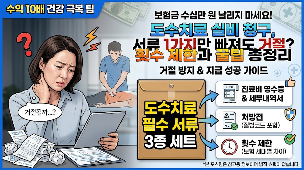 하지만 막상 보험금을 청구하려고 하면 어떤 서류가 필요한지, 몇 번까지 받을 수 있는지 헷갈리기만 합니다. 자칫 서류 하나라도 누락되면 청구가 거절되거나 지연될 수 있습니다. 오늘은 도수치료 실비 청구 시 꼭 챙겨야 할 필수 서류와 보험사도 잘 안 알려주는 횟수 제한의 진실, 그리고 거절 방지 꿀팁을 완벽하게 정리해 드립니다.